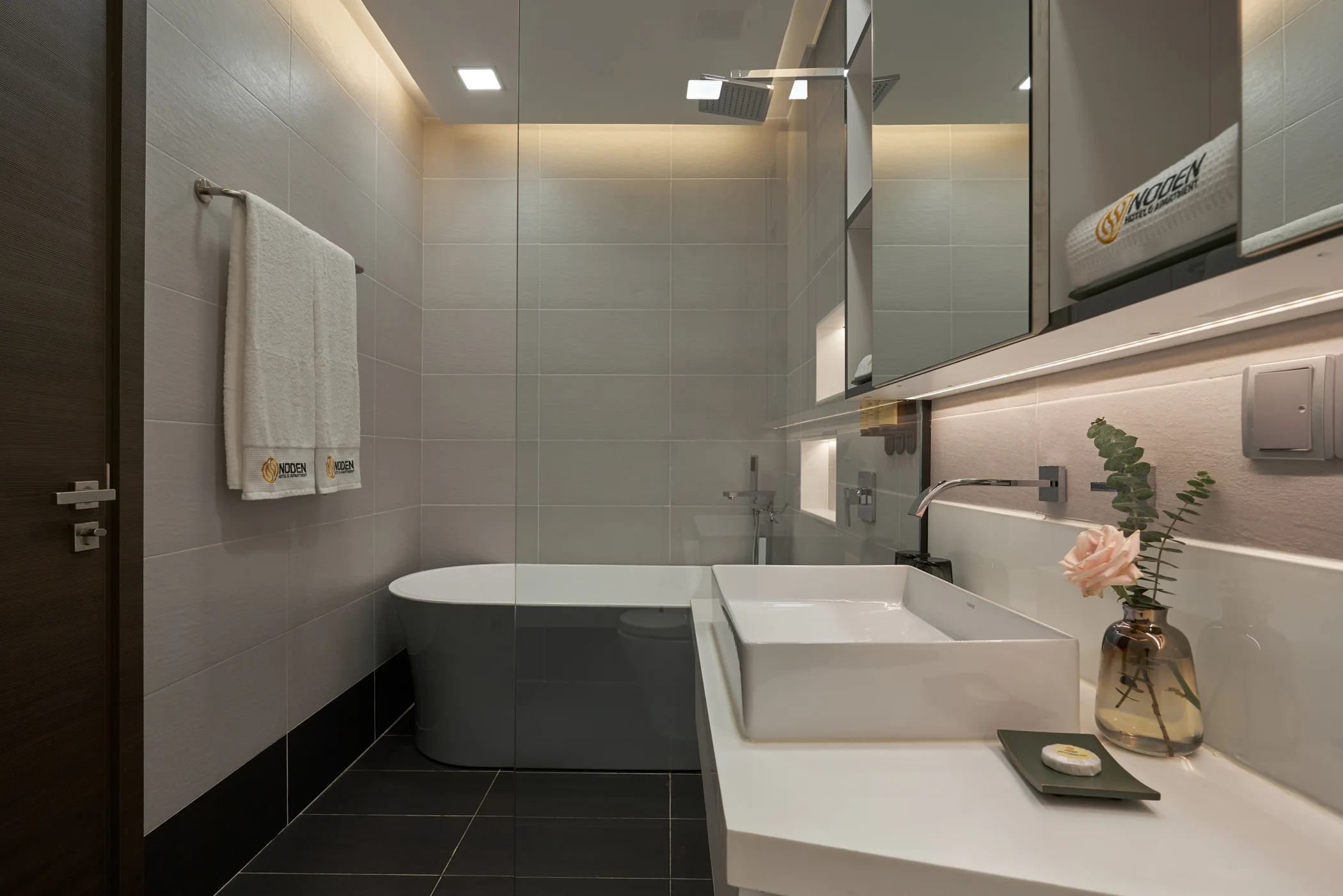 - Bathtub / Razor / Cotton buds / Shower cap / Hair dryer / Soap / Shampoo/ Conditioner / Shower Gel / Sanitary bag / Tooth brush / Comb/ Mirror/ Towels